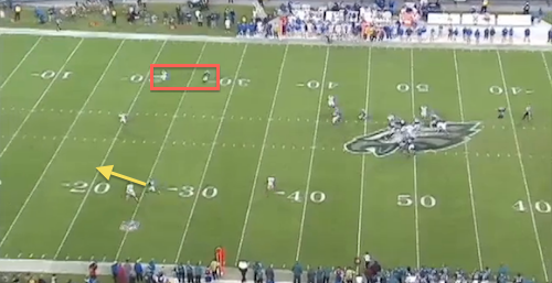 Play 5: Another chance with Maclin. Here, Vick scrambles to his right, but look at who’s streaking down the sideline behind the defense, open for a potential touchdown.