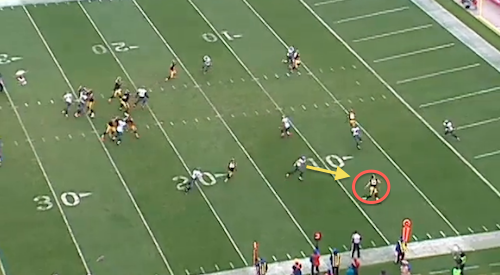 But Roethlisberger gets pressured and steps up in the pocket. He presumably sees that there is all kinds of room behind Wallace and lofts one downfield, allowing the receiver to try and make a play, even though I don’t believe that’s where the route was originally intended to go.