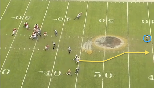 Play 1: Would you believe that on the Redskins’ first touchdown, Darrel Young wasn’t even the most wide-open receiver? Take a look at tight end Logan Paulsen (blue circle) in the back of the end zone. I mean, there’s not a single defender in the same area code.