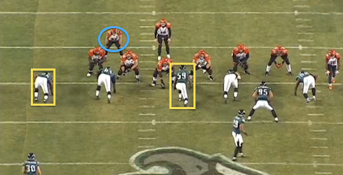 The key is DeMeco Ryans, who is hovering in the A-gap between the center and the left guard. The Bengals know they have to account for him possibly blitzing.