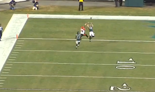He breaks up the pass and nearly comes up with the interception.