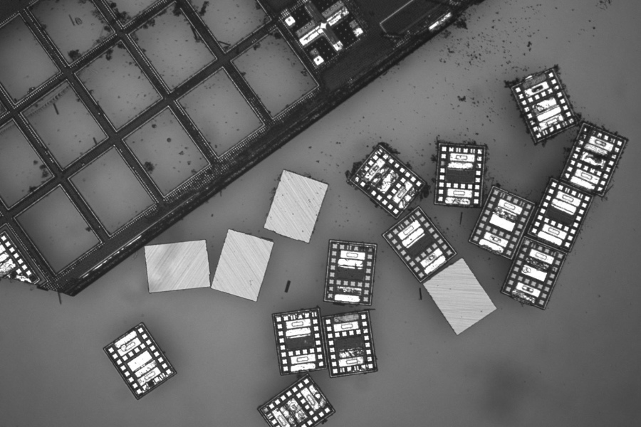 The final stages of micro robot fabrication deploy hundreds of robots all at once. The tiny machines can then be programmed individually or en masse to carry out experiments. / Photograph by Maya Lassiter
