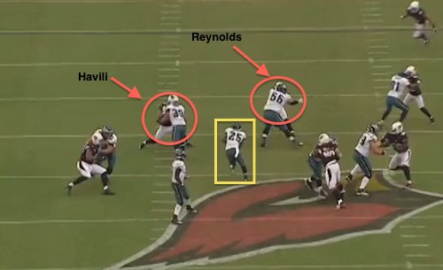 Keep in mind, this is 1st-and-15. It’s not like we’re looking at an obvious passing situation. It’s clear that a run up the middle is the last thing the Cardinals are expecting. Reynolds and Stanley Havili deliver good blocks, and the Eagles pick up 7 yards.