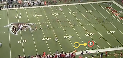Part of the pre-snap calls for Vick and Reynolds involve identifying where the safeties are. You can see that the Falcons don’t make that easy.