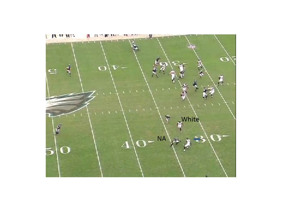 Jones starts out as if heading downfield, then peels back. Asomugha tries to adjust but White is closing in and is in perfect position to wipe him out. (The refs initially threw a flag on White before determining that the block came within the extended neutral zone.)