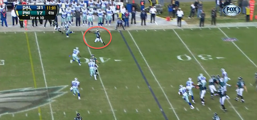 On a different play, Foles had pressure in his face right away and tried to hit LeSean McCoy in the flat. Anthony Spencer was there for the interception, but the Cowboys were flagged away from the ball.