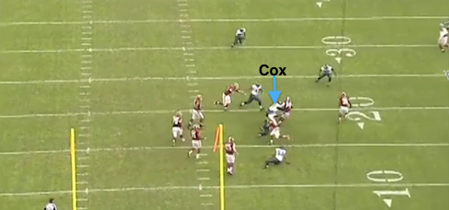 Play 2: Ok, I promised to throw in some positives. I had to watch this one a few times to make sure my eyes weren’t deceiving me. Check out where Cox is when the toss goes to Alfred Morris on the option.