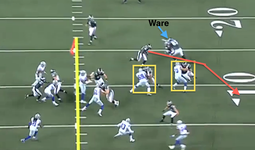 Evan Mathis (highlighted in yellow to your right) throws the key block. And Dallas Reynolds takes care of the linebacker. Another key aspect of the play design iss Riley Cooper going inside. The Cowboys initially have two defensive backs to that side of the field, but Cooper takes them with him. And Brown has nothing but open field in front of him.