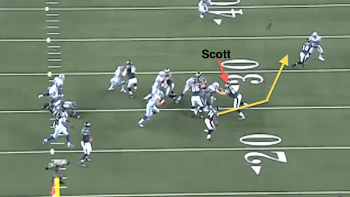Play 3: Nice job here by Scott, who has to get outside the defensive lineman to execute his block.