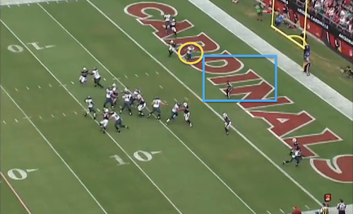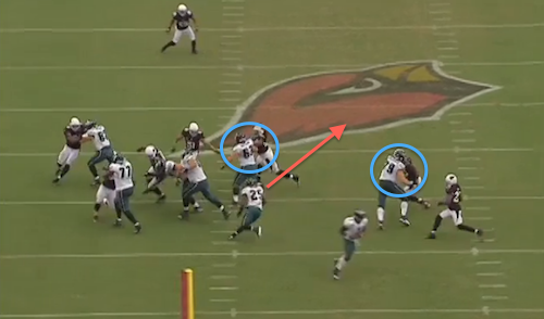 Keep in mind, this is 1st-and-15. It’s not like we’re looking at an obvious passing situation. It’s clear that a run up the middle is the last thing the Cardinals are expecting. Reynolds and Stanley Havili deliver good blocks, and the Eagles pick up 7 yards.