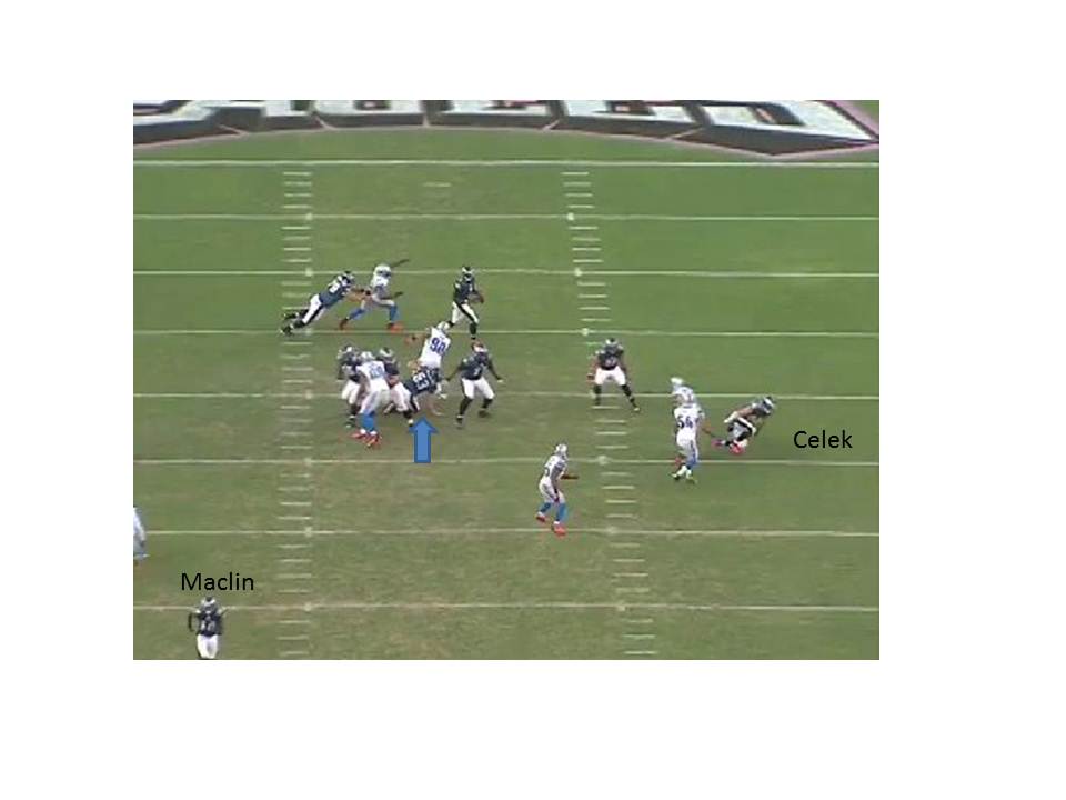Here you see Celek just rising to his feet. Maclin, at the bottom corner of the shot, has his back turned and is no option. The blue arrow shows Ndamukong Suh beating Danny Watkins, who is on his knees in this frame. If Avril doesn’t get Vick, Suh will apply the pressure. And Vick doesn’t have anywhere to go.