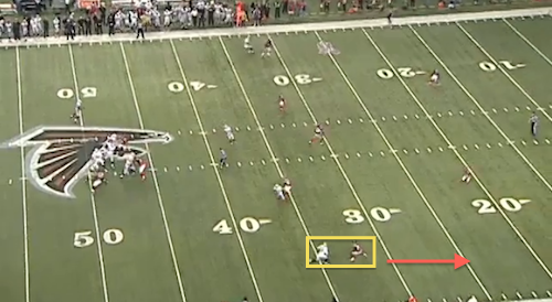 Part of the pre-snap calls for Vick and Reynolds involve identifying where the safeties are. You can see that the Falcons don’t make that easy.