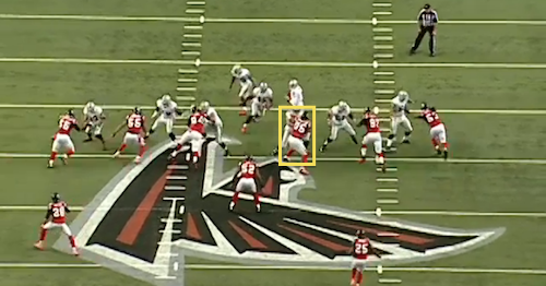 7. There is a lot going on for the Falcons on any given play. Let’s start with their pre-snap looks. Here, you’ll see they stack the box with eight defenders against the Raiders. The key is the safety, Moore, who hovers around the line of scrimmage. This is a couple seconds before the ball is snapped. It appears that the deep middle of the field is going to be wide open.