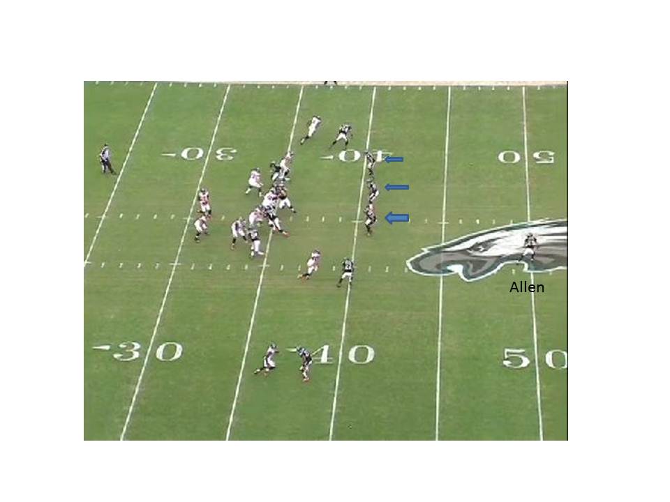 Asomugha could have executed better, no question. However, Jones — boasting 4.3 speed — is a difficult matchup for anyone, and Asomugha receives no help on this play. As the next still shot illustrates, three Eagles defenders are protecting the middle. Meanwhile, three Falcons receivers are releasing downfield. Allen is stuck in no-man’s land.