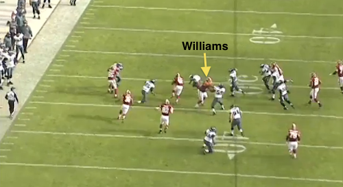 Play 3: This one’s going to really make you miss Jason Peters. If you’re not prepared for that, move on to the next play. Check out Redskins left tackle Trent Williams on DeMeco Ryans on a toss to Morris in the second.