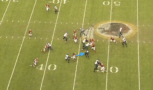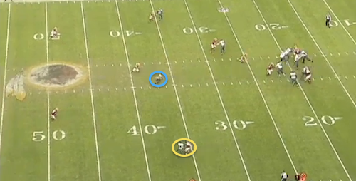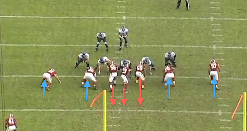 Play 4: This is the kind of play we see every week. The Redskins crowd the line of scrimmage. It looks like they’re going to bring pressure up the A-Gaps, but they end up only rushing four.