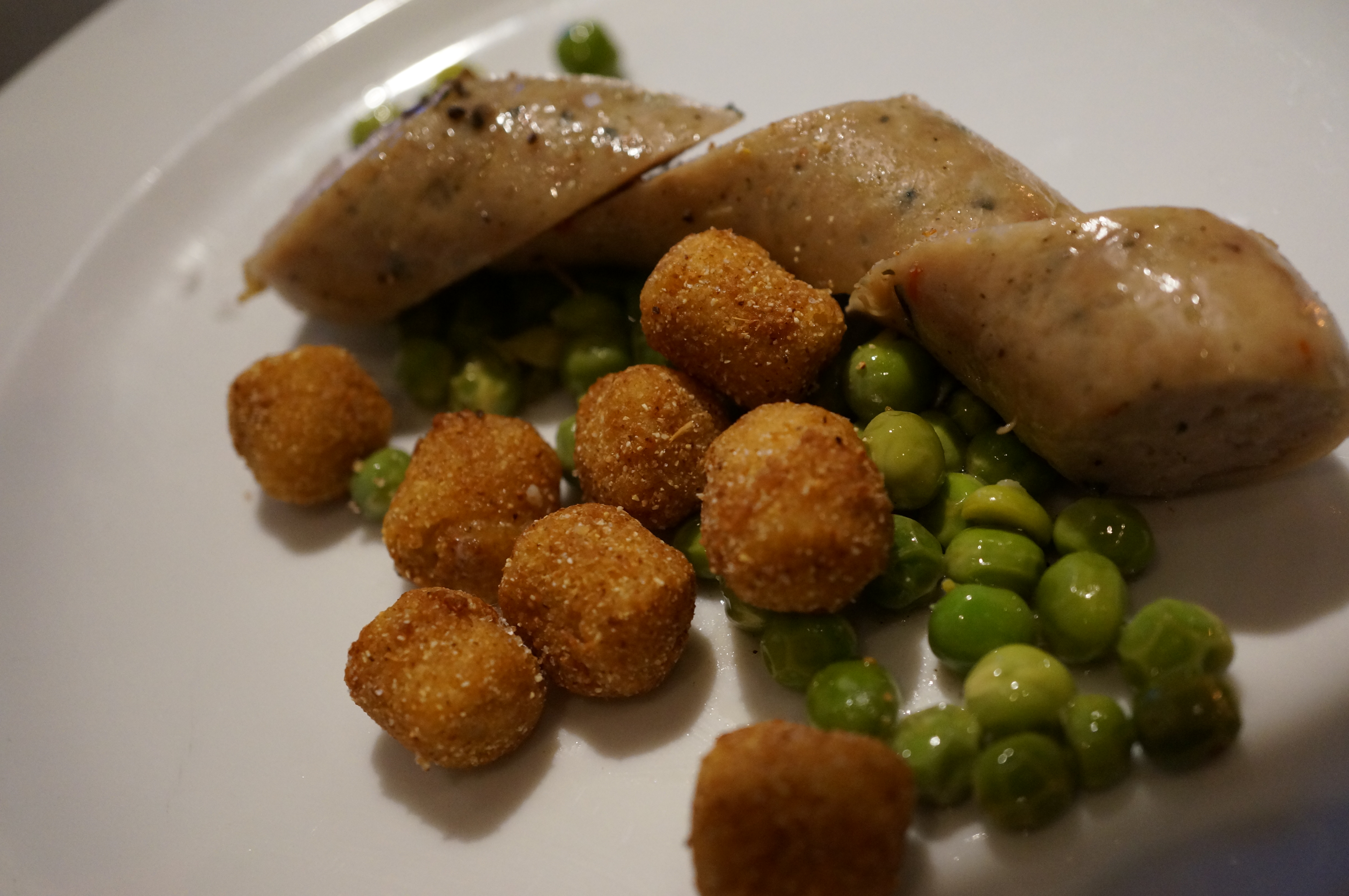 Team Gaslight poached homemade chicken sausage in pilsner hop tea, laid it out alongside some truffled peas, threw in some cascade hop vinegar, and then made some malt-crusted cornbread gnocchi.