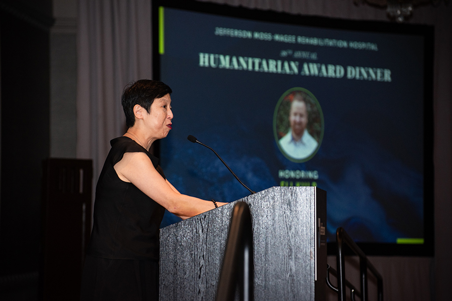 Ellen Yin speaking at the ceremony honoring chef Eli Kulp as the 2025 Jefferson Moss-Magee Rehabilitation Humanitarian Award recipient. / Photograph courtesy of Jefferson Moss Magee