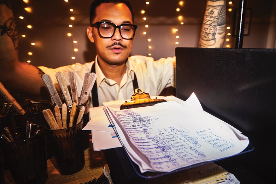 Phila Lorn glancing at the guest list / Photograph by Stevie Chris, originally published in Phila and Rachel Lorn’s Trick to Success? Desperation