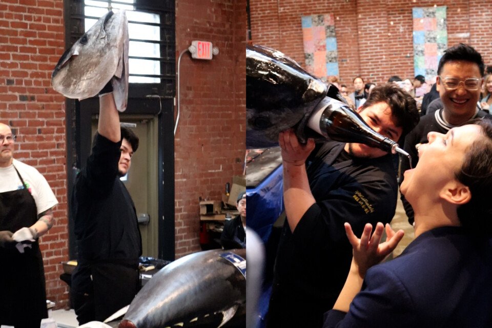 The maguro kaitai show, as it’s called in Japan, is a culinary presentation meant to honor the tuna by breaking it down and serving prized cuts to the audience. I was expecting it to be a calm, serene, almost ceremonial process — like watching a master sushi chef find their flow state while making nigiri. But then chef Carlos Wills of Ogawa decapitated a 250-pound bluefin tuna with a sword-like maguro bocho knife made of steel, stuck a sake bottle into the fish’s sawed-off head, and started pouring shots directly into people’s mouths, and I realized that this was more than just performance art — this was a wild sushi party where controlled chaos meets craftsmanship.