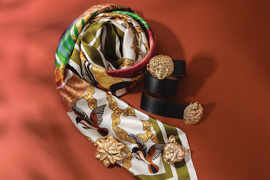 The 18-karat gold-finished belt buckles are based on images of founder Mary Lynn Harris’s mother and daughter.