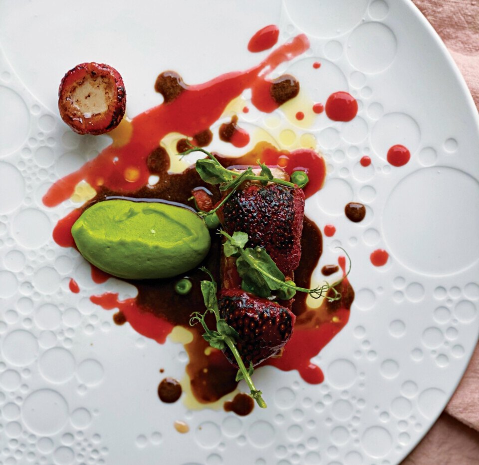 The pork chop with pea purée, strawberries, molasses, and pickled cherry peppers at Heirloom Kitchen / Photograph by Neilly Robinson