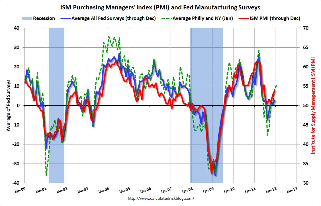 This week, these latest surveys are released. We’ve already learned that while manufacturing in the New York region continues to grow, the growth is slowing. Expectations in Philadelphia aren’t expected to be much different. Check out the dotted green line on this graph, which combines both regions. It’s moving back up, thank God, and like so many other indicators is higher than recession levels. But the average is about 55 compared to the high 60s in 2003-2004. And what’s really concerning is that manufacturing levels in 2011 were nearing those 2003-2004 amounts before dropping off again. Unfortunately, we can’t seem to sustain the pace.