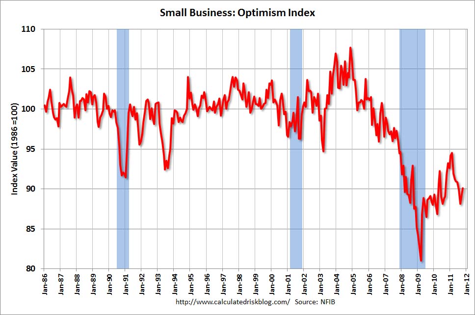 Of all the small business indicators that come out every month (and there are many), the Small Business Optimism Index published monthly by the National Federation of Independent Businesses gets (and deserves) the most media attention. Last month, optimism fell. But take a look at this chart and you’ll realize that’s not even half the story. Optimism levels are certainly above what they were during the recession but are still way below what they were before the recession. Basically, we’re about 85 percent as confident about the economy as we were back in 2004. But more interestingly, our confidence in the economy is still significantly behind our confidence levels during the last two recessions. Even then our optimism never lacked. Today, it does.