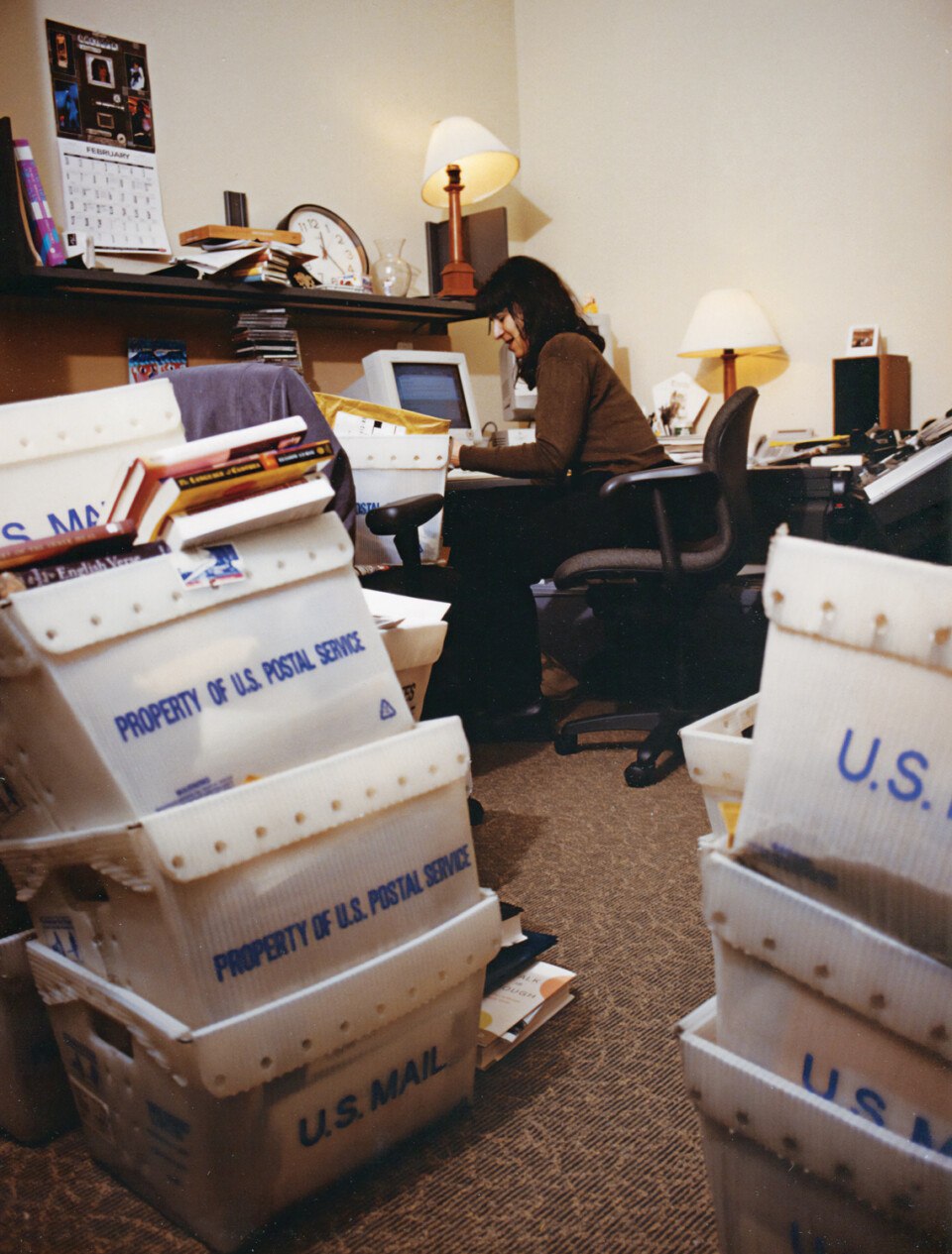 Amy Salit sorts through the mail in the mid-’80s / Photograph courtesy of WHYY