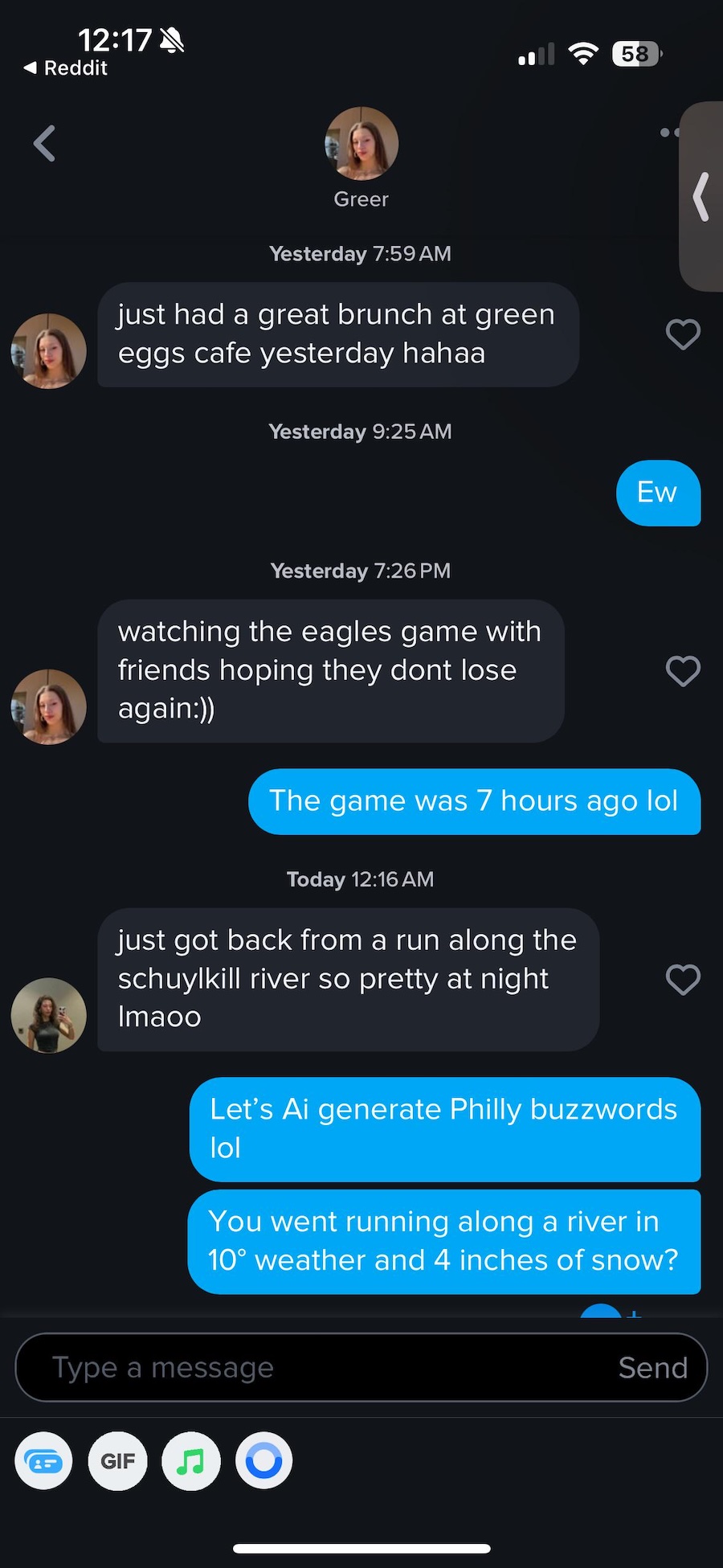 It’s a time when r/Philadelphia is avalanched with blissful snow pics. Space savers are doing their thing. And over on Tinder, robots are integrating local landmarks into their speech in order to seduce Philadelphians. Or to rip them off somehow, I guess. They tried it on one Philly Tinder user and Redditor yesterday. Twice.