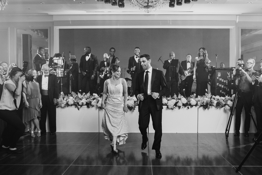 After a ten month engagement, the pair wed at The Logan Hotel in a fun, elegant celebration with 219 of their friends and family. The couple had a grand cocktail hour featuring an ice bar with frozen orchids for their sushi station, and apps like avocado and apple tartlets, beet-cured salmon on potato pancakes, and duck confit crepes.