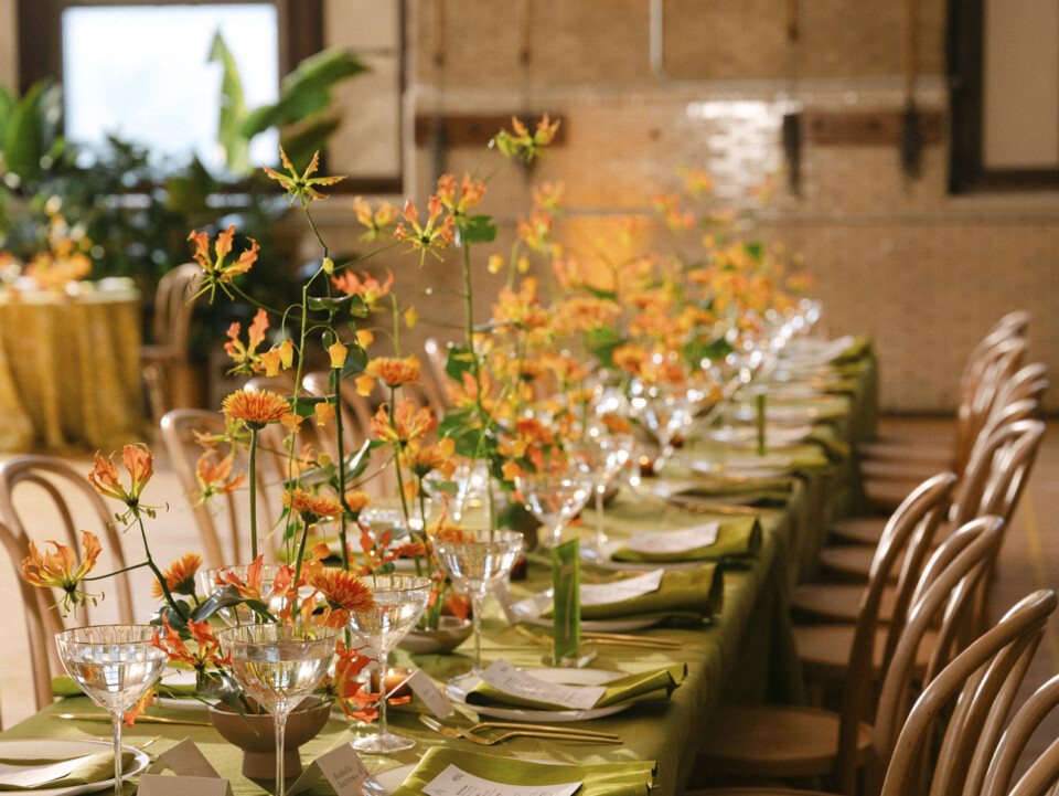 “Our wedding party really understood the assignment and made our color story come to life,” says Sophia of the attendants’ outfits, a vibrant kaleidoscope of lilac, orange, and chartreuse. Each carried a bird-of-paradise stem down the aisle, a callback to the party where Sophia and Adri first met and a complement to the tropical theme.