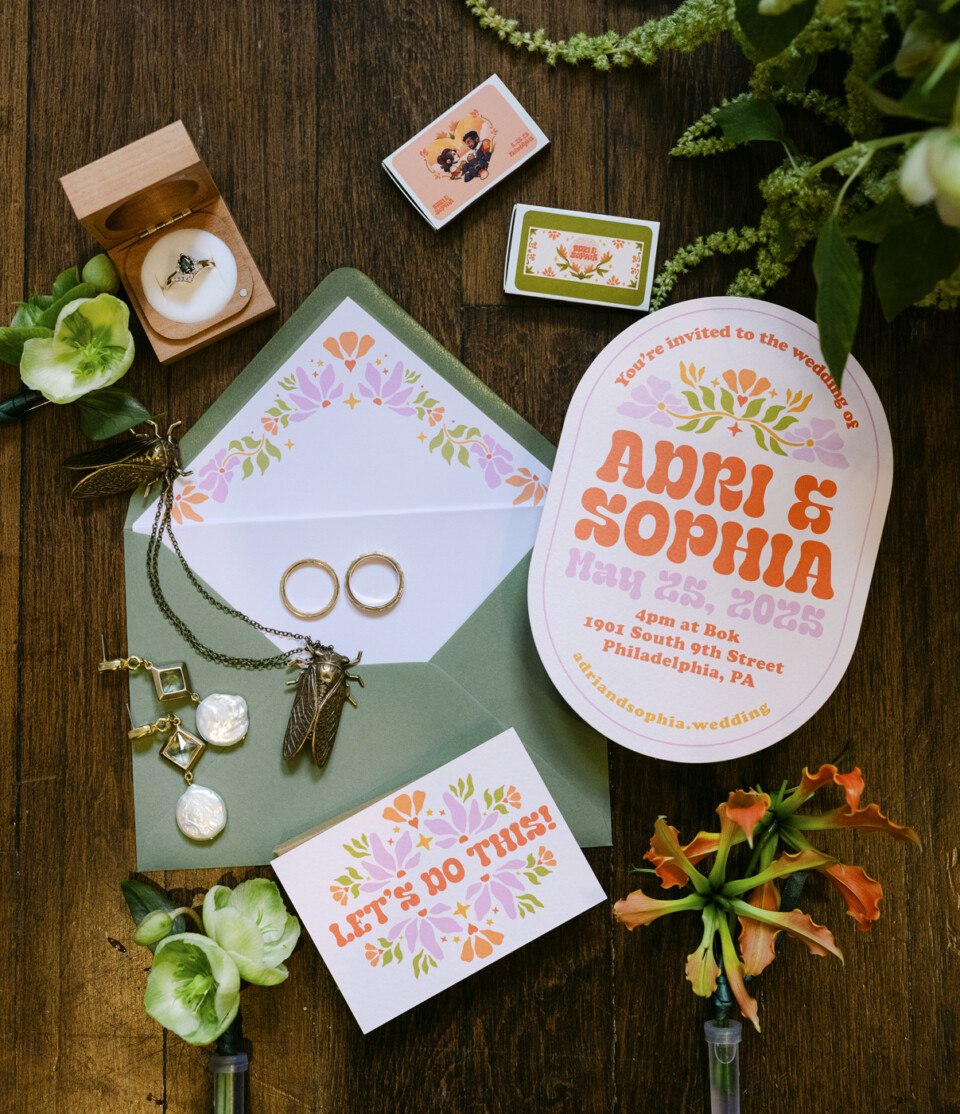 It’s impossible to recount the love story of Sophia Geffen and Adri Rosembert without talking about their friends. The duo met at a mutual pal’s bird-of-paradise–themed party in 2018. (“I thought Sophia was so captivating,” Adri says.) Five years later, their close-knit group would join Sophia and Adri in Massachusetts to toast their engagement, and two years after that, they would all gather on the roof of the Bok Building in East Passyunk to watch as the couple said their vows.