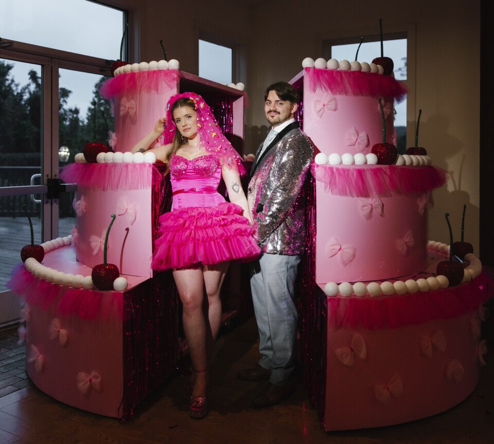 For many, the idea of popping out of a six-foot-tall wedding cake at your reception wearing a hot-pink veil covered in tiny Barbie shoes would feel like a fever dream. For Madison Chamberlain, a designer of nontraditional bridal dresses and veils, it was only fitting. She’d created two looks for her marriage to Jonáš Toupal, held at the Inn at Barley Sheaf Farm: an embellished green gown for the ceremony and dinner, and a pink minidress for dancing. “I wanted to look like a hot-pink Barbie ballerina,” Madison says. Jonáš, who initially wore a light blue suit, had a sequined jacket waiting in the wings.