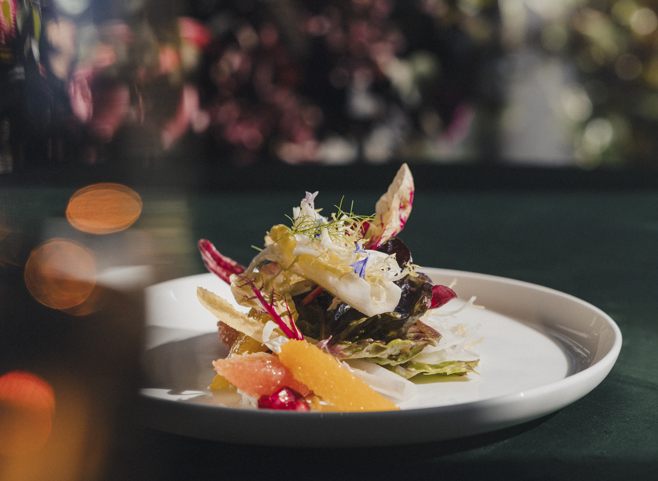 The citrus endive salad with feta, pomegranate, shaved fennel, orange, and grapefruit, prepared by chef William Brown