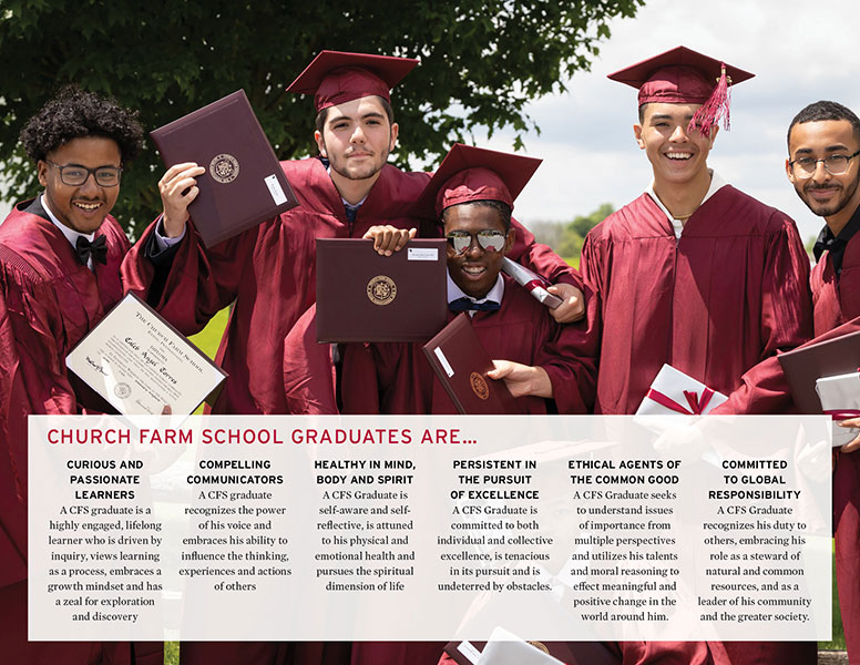 The Church Farm School prepares a diverse group of boys in grades 9-12 with academic ability and good character to lead productive and fulfilling lives by making a college preparatory education financially accessible.