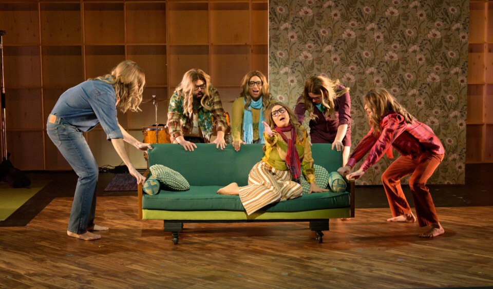 And so the Wilma partnered with the company to bring the Poor Judge back for its current mid-January run. Much of the original cast and crew signed on to return, including music director Alex Bechtel (whose arrangements of Mann’s songs earned a Barrymore Award), choreographer Chelsea Murphy, set designer Maria Feuereisen, and all of the actors portraying the six-person ensemble of Aimee Mann replicas, dressed in her unmistakable blonde hair and black glasses.